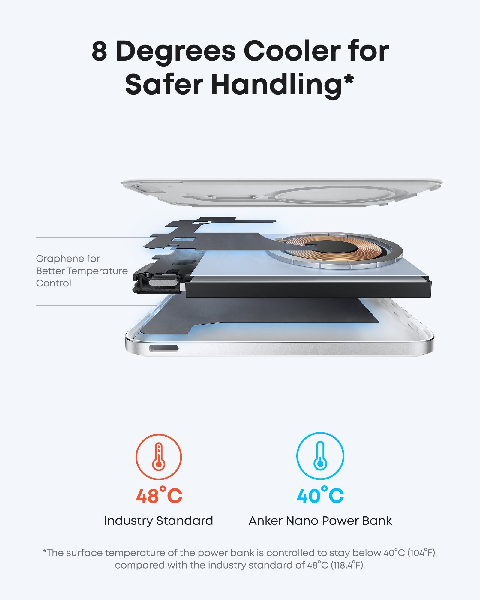 - 40°C for Safer Handling: Innovatively designed with heat-dissipating graphene, dual NTC chips, and real-time adjustment software to stay below 40°C during use, 8°C cooler than other power banks, for safer and more reliable charging.