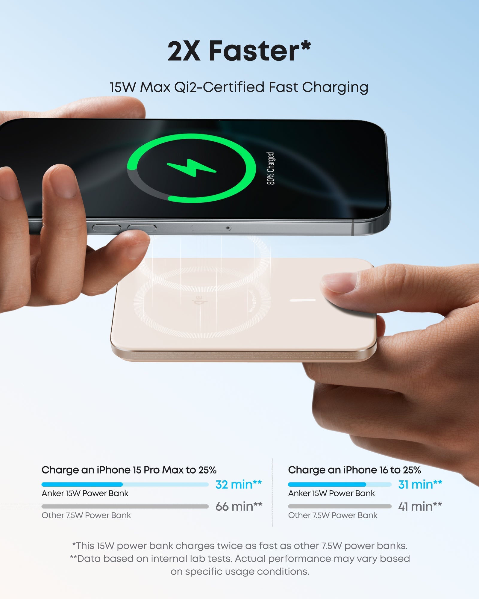 - 15W MagSafe-Compatible Charging: With 15W MagSafe-compatible fast charging, Anker Nano Power Bank charges iPhone 16 Pro to 25% in just 42 minutes. (Data based on internal lab tests; actual charging performance may vary.)