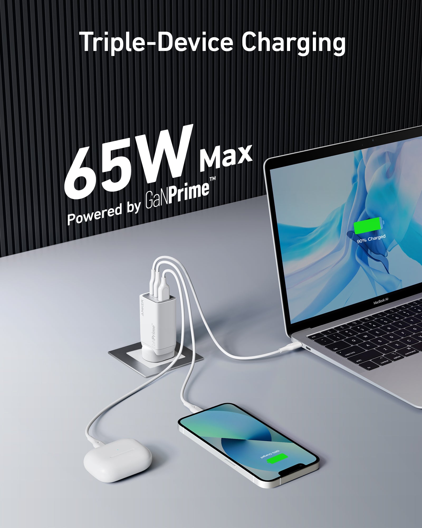 - Power 3 Devices at Once: With 2 USB-C ports and one USB-A port, you can charge your phone, notebook, and earbuds all at once from a single charger. Connect a single device to charge at up to 65W.