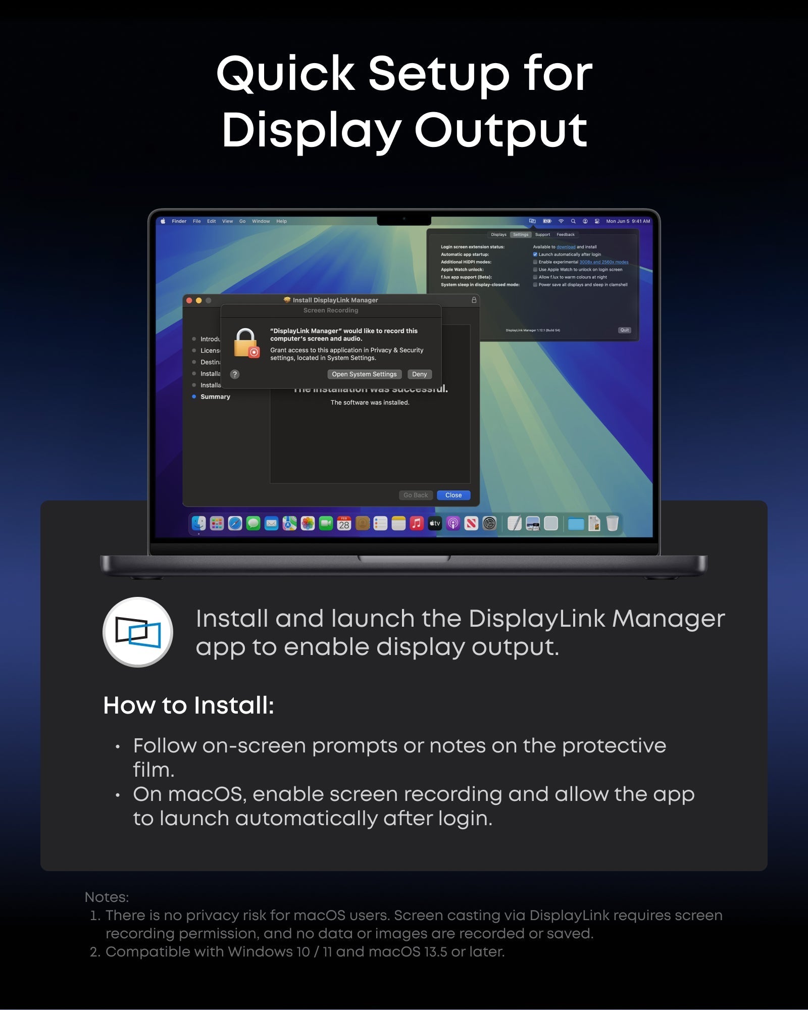 - One 8K Output, Triple Display Versatility: Power up three external monitors at once, including one in 8K, for ultra-efficient multitasking. Compatible with both macOS and Windows setups. (Note: Only monitors that support 8K resolution can display in 8K. DisplayLink driver required.)