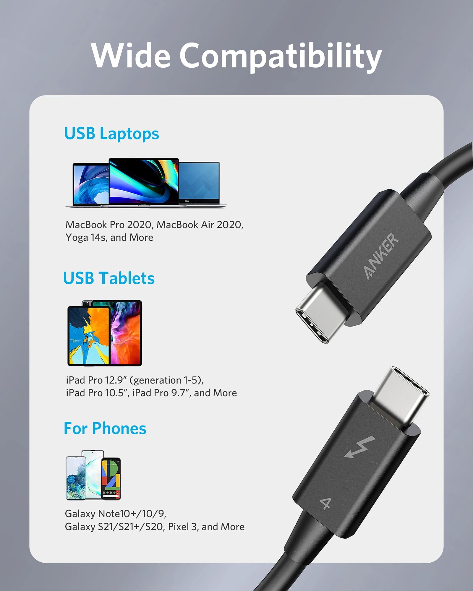 - What You Get: Anker USB-C to USB-C Thunderbolt 4 100W Cable (0.7 Meters), welcome guide, our worry-free 18-month warranty, and our friendly customer service.