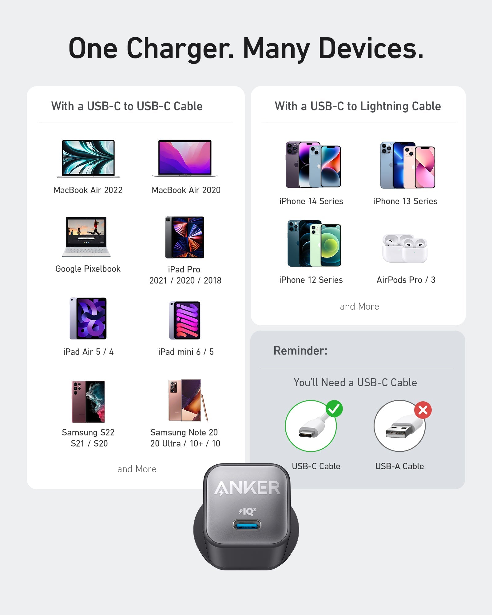 Nano Now Charges Everything: Upgraded with a 30W output so now you can charge your earbuds, phone, tablet, and even your MacBook Air with a tiny charger.