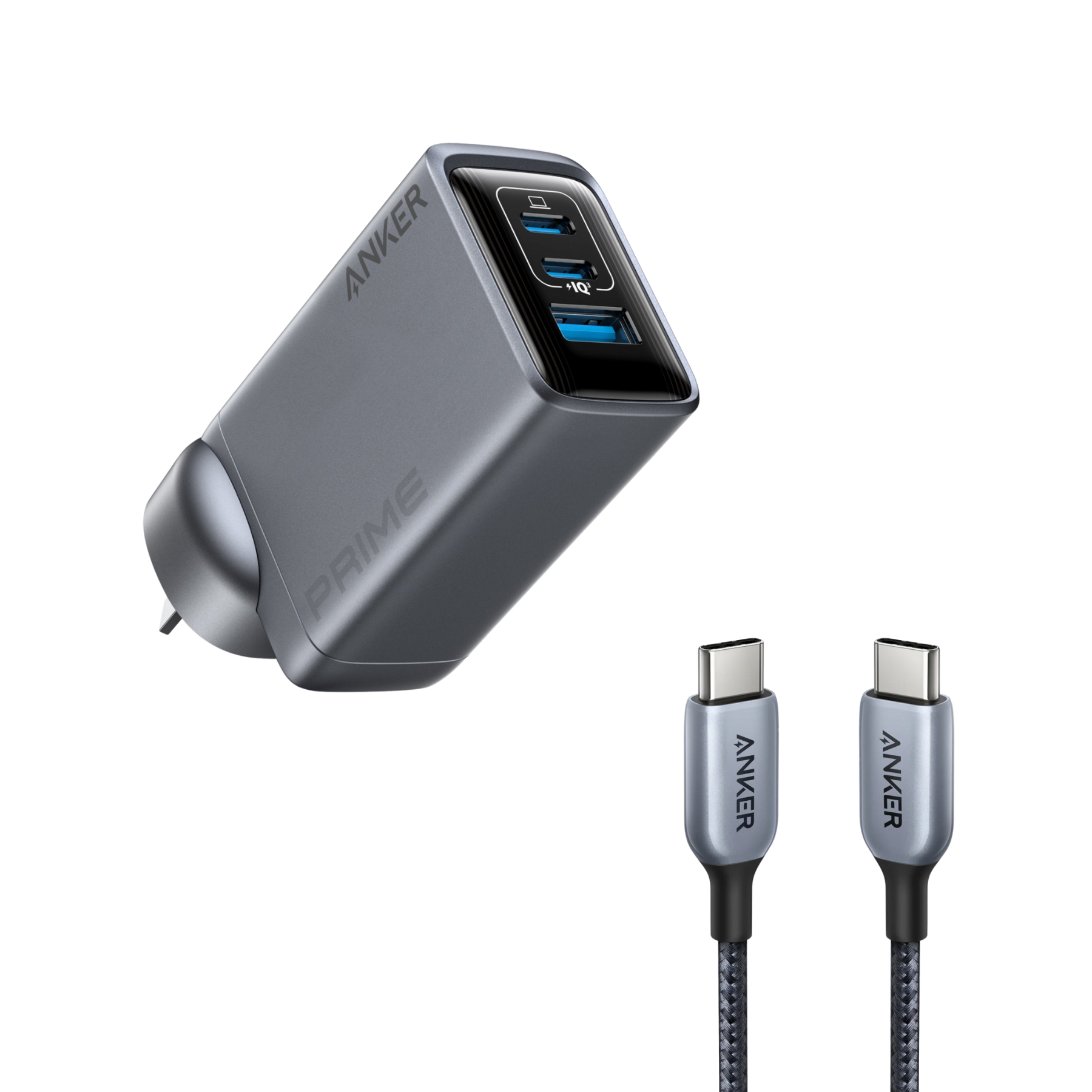 Anker Prime Charger (100W, 3 Ports, GaN) and Anker 765 USB-C to USB-C Cable (140W Nylon,183cm)